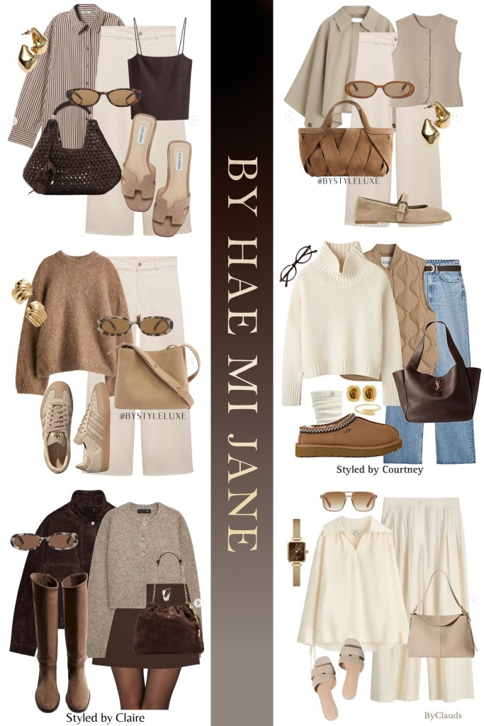Structured brown or cream bags tie the outfits together. Look for clean shapes—totes, crossbody bags, or minimalist shoulder bags.