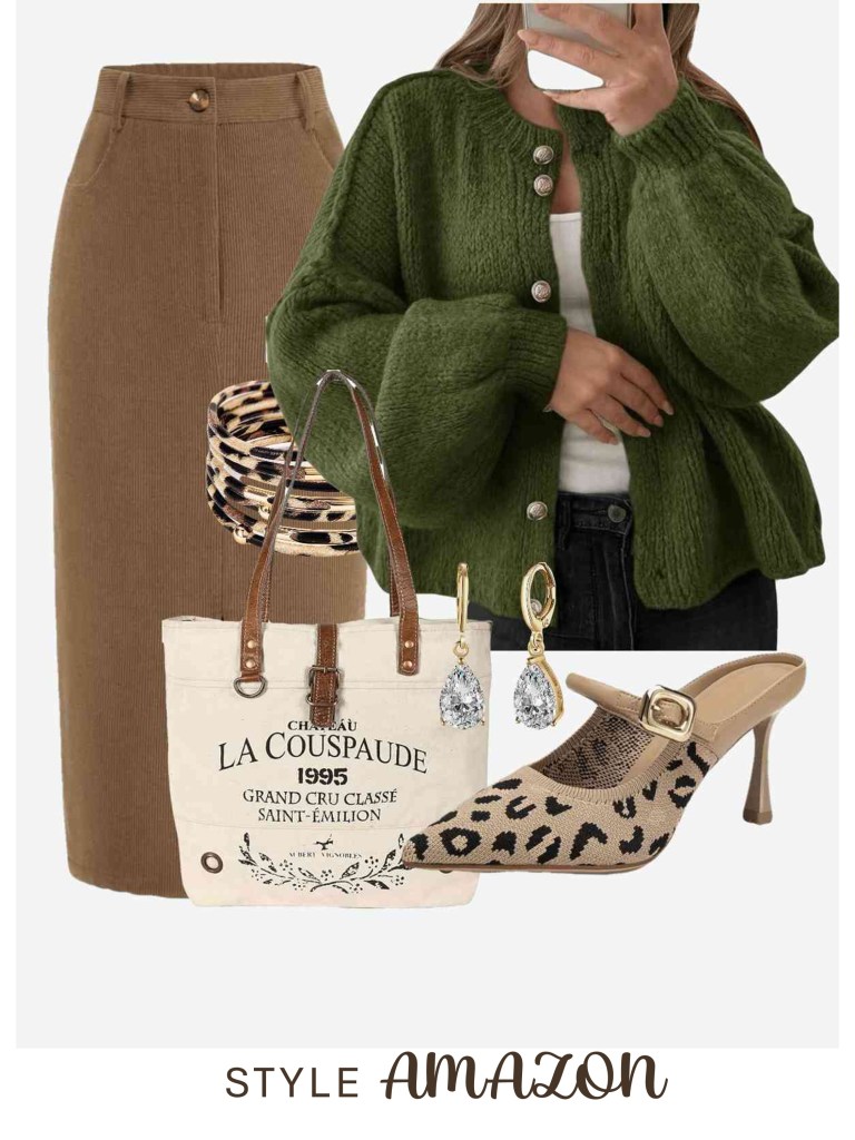 This outfit leans into the “cozy update” trend with an oversized pink cardigan that feels like being enveloped in your favorite blanket. Burgundy sneakers provide a tonal anchor that balances the playful “Cherry” graphic tote.