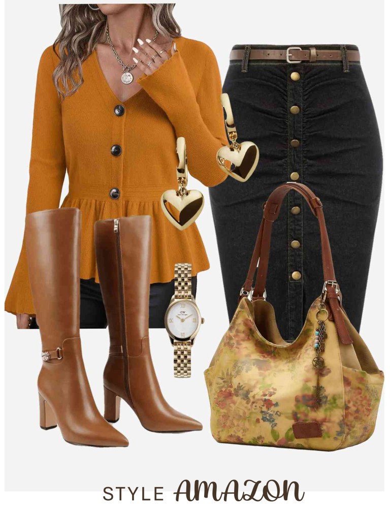 This look is all about “soft but structured” winter dressing. The vibrant yellow cardigan with feminine ruffle detailing adds a cheerful pop of color to neutral, high-waisted wide-leg trousers.