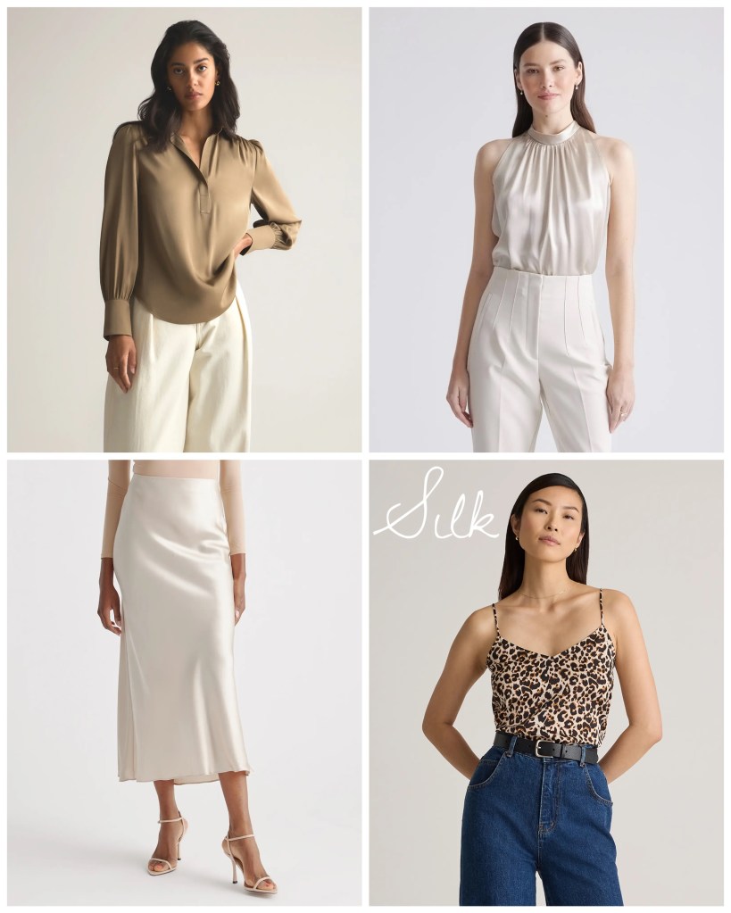 - What to look for: Cashmere, wool, silk blends, satin, and structured cotton.