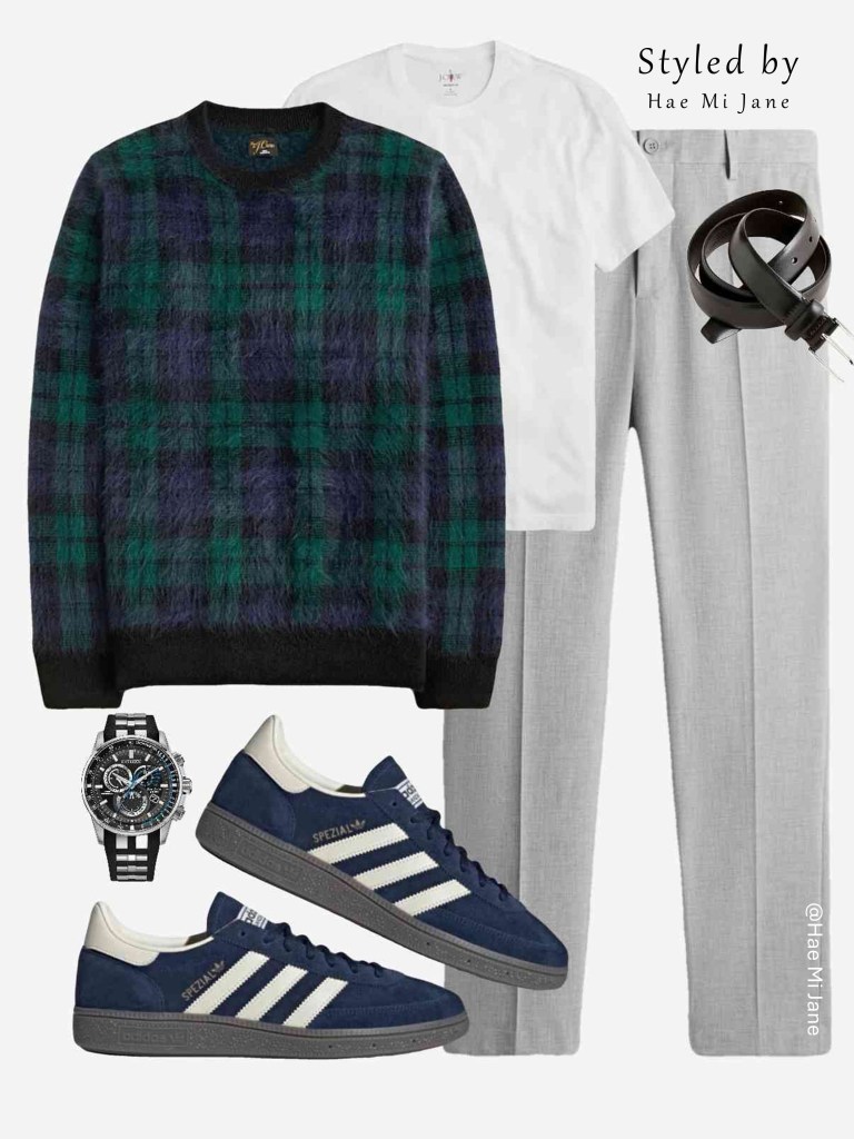 Occasion: Creative workspaces or dinner with friends. A bold men’s style statement using a fuzzy forest green plaid sweater to add visual interest to a classic trouser.
