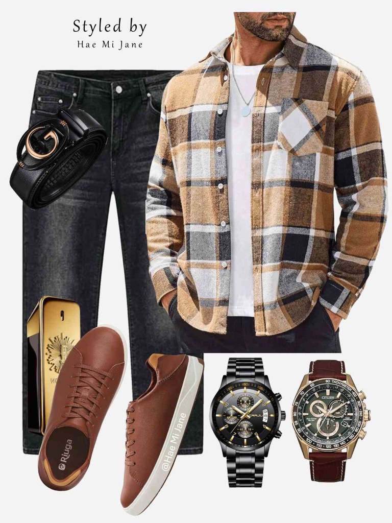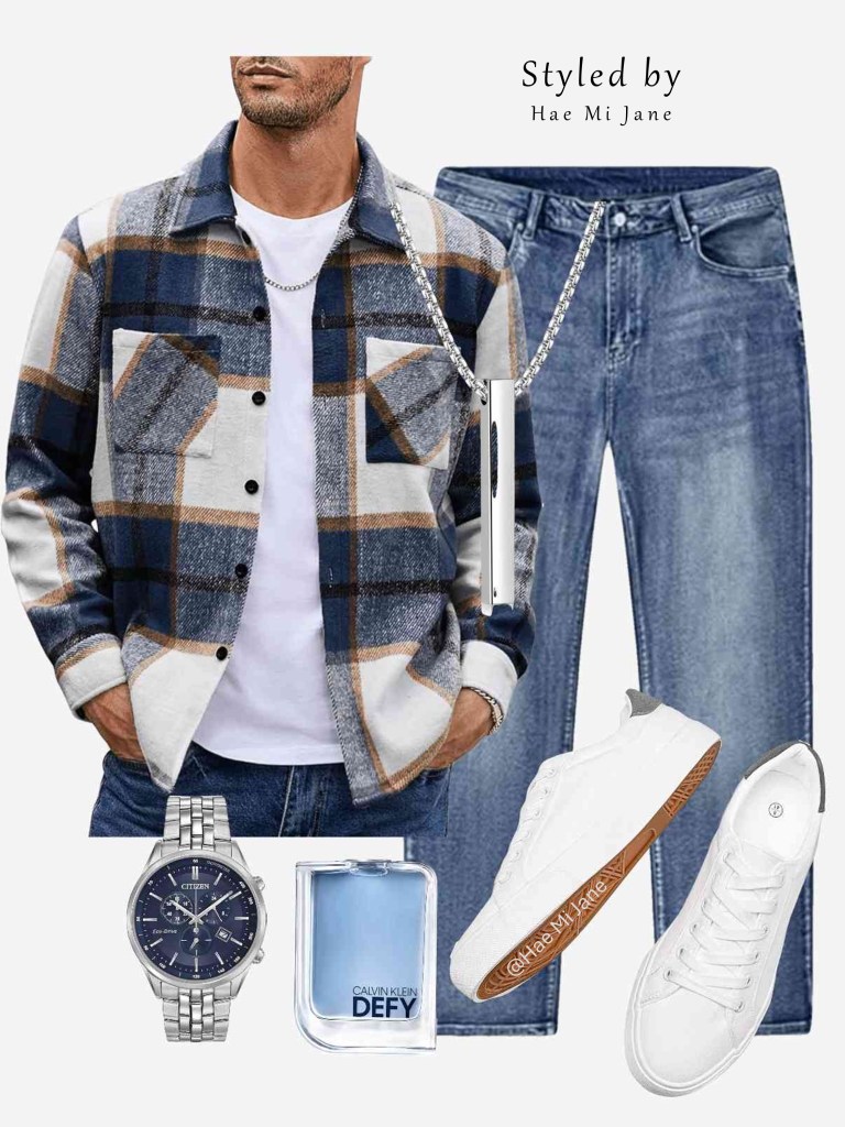 Occasion: Daytime dates or road trips. A quintessential men’s casual look. Blue and tan plaid worn open over a white tee for a relaxed, approachable feel.