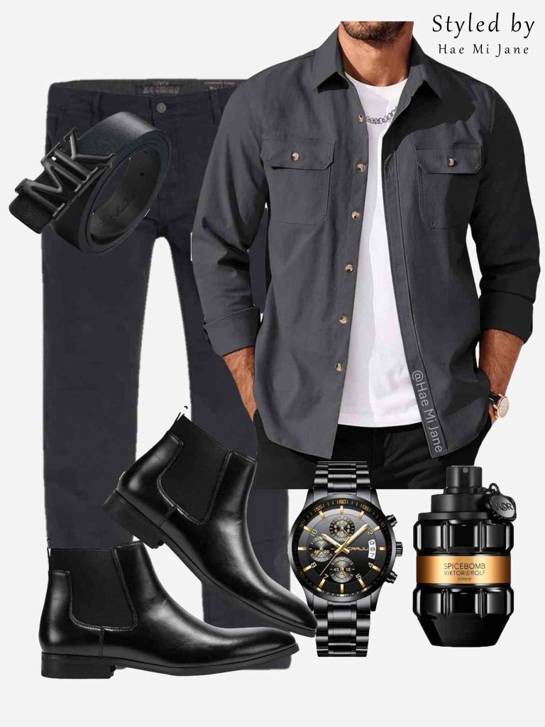 Occasion: Night out or concerts. A sharp men’s monochromatic statement. Charcoal utility layers over black Chelsea boots for a long, lean silhouette.