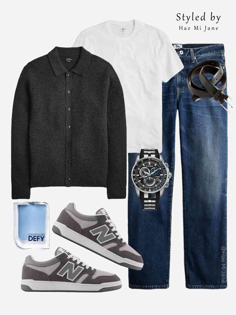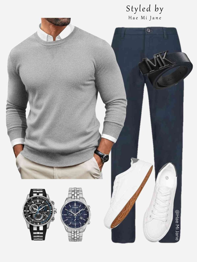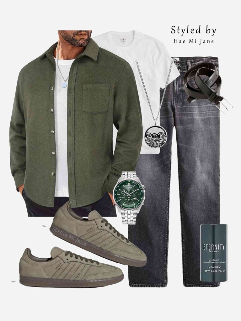 Occasion: Casual office day or coffee date. This look plays with olive and grey tones for a moody, sophisticated men’s aesthetic. We’ve layered a sage green textured sweater over a white button-down for a preppy touch.