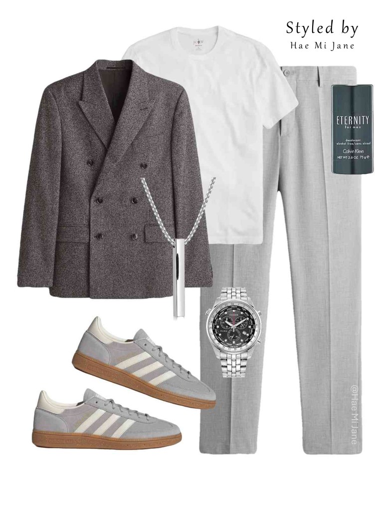 Occasion: Business casual meetings or dinner dates. A sophisticated men’s tonal look featuring a double-breasted charcoal blazer and approachable grey sneakers.
