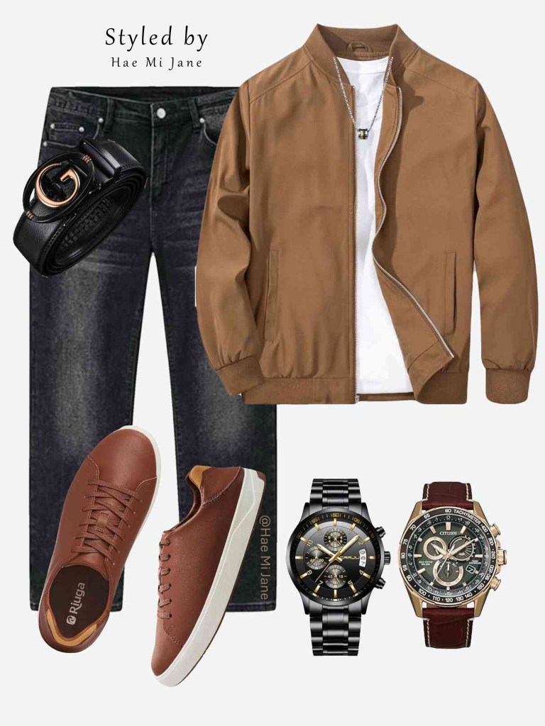 Occasion: Casual Saturday outings. A rugged yet clean men’s aesthetic centering on a tobacco-brown bomber jacket and sturdy dark denim.