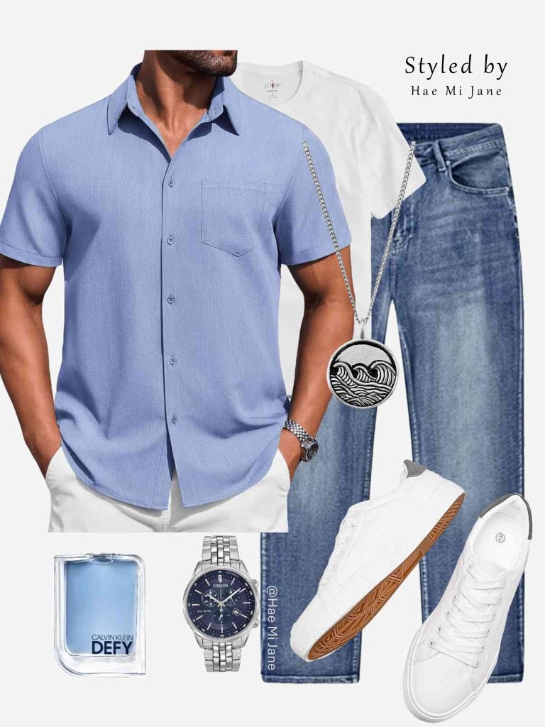 Occasion: Weekend brunch or pier stroll. Perfect for men’s summer fashion, this outfit centers on a light blue short-sleeve button-down layered over a crisp white tee.