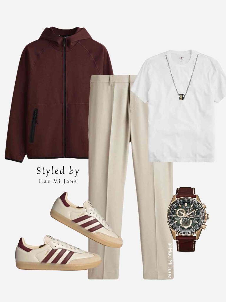 Occasion: Errands or relaxed movie night. This outfit balances athletic tech with men’s tailored style, featuring a maroon zip-up and stone-colored trousers.