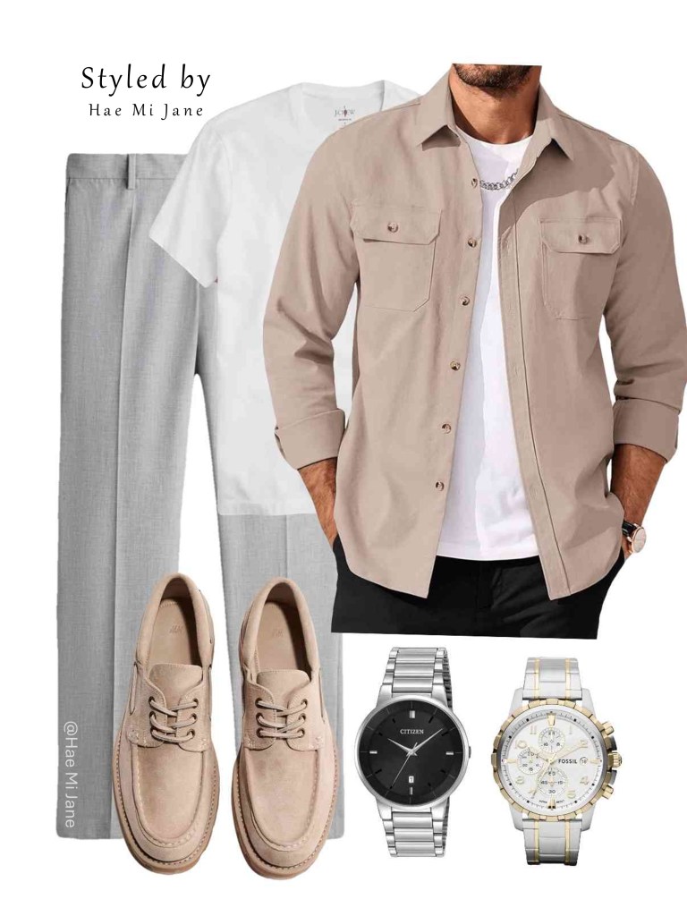Occasion: Casual summer weddings or vacation dining. Men’s utility fashion meets elegance. This tan double-pocket shirt and light grey dress trousers offer a refined Mediterranean feel.