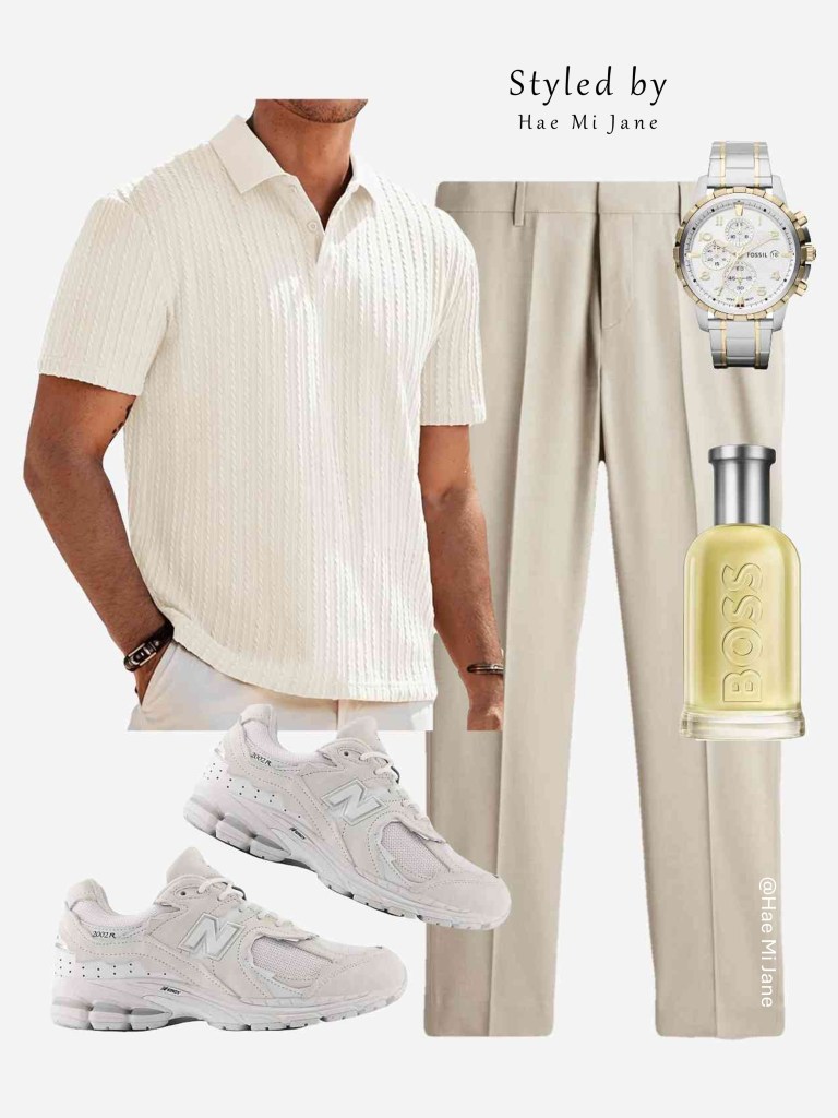 Occasion: Upscale garden party or resort dinner. Leaning into the “Quiet Luxury” men’s trend, this look focuses on a cream vertical-knit polo and tonal beige chinos.