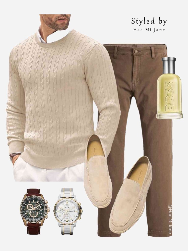 Occasion: Family brunches or holiday gatherings. A timeless men’s preppy aesthetic featuring a cream cable-knit sweater and suede loafers for a soft, inviting look.